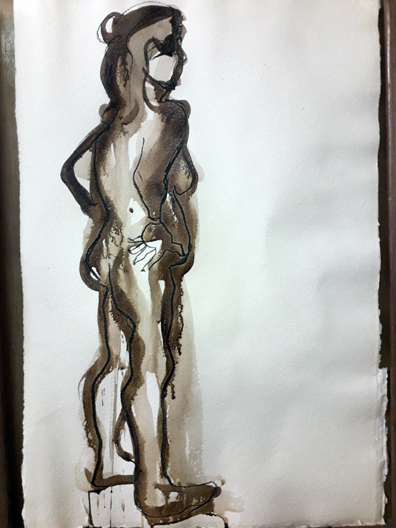 Here are a couple more life drawings from the other night, at Swansea Print Workshop, one for 20 minutes and one for 10. I’m using my home made walnut ink onto various heavyweight vintage papers, with a large round squirrel brush. I’ve used conte crayon right at the end to add a bit of fine line work.