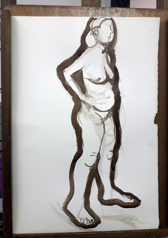 Here’s one of the 30 minute poses from the life drawing session at Swansea Print Workshop last night. It’s good to be back, even if the numbers are so restricted. I tried doing an online life drawing class once during lock down but I couldn’t get on with it at all. Our models are a significant presence in the room, they bring their personality as well as their physicality to the drawing and I miss that with an online session. I used my own home-made walnut husk ink onto a heavy vintage paper.