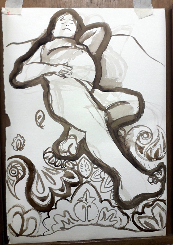 I love to draw reclining poses, I’m a bit of a glutton for punishment and I like the challenge of foreshortening. This one was challenging! I think I’m going to work on this with acrylic paints and really make a feature of the patterned throw.
