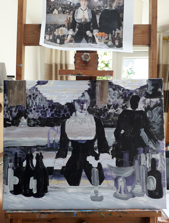 I did some more work on my copy of Impressionist artist Edouard Manet’s “Bar at the Folies Bergere” today, getting the figure blocked in and making some adjustments to the size and shape of the bottles in the foreground. At the moment there’s very little colour in it, black, white and warm greys, but there will be some sizzling oranges, pinks and golds to come. I’m doing this in one of Ed Sumner’s painting tutorials – a two-parter on consecutive Wednesdays. It’s very demanding and it’s really pushing me, but I’m loving it.