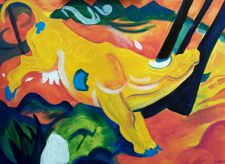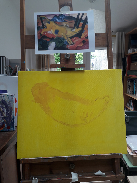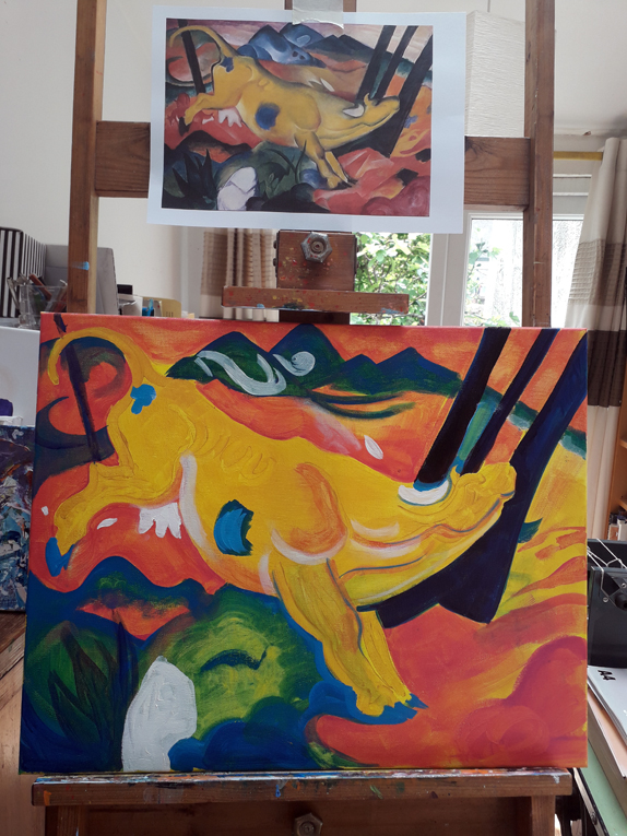 Finished faffing and faking Franz Marc’s “The Yellow Cow”. It’s very richly coloured with lots of layers of glazes built up on top of each other, lots of blending too. Took a while but I really enjoyed it. I started it with Ed Sumner’s Cheese and Wine Painting Club on Facebook last week. Here are the stages I went through. I used Liquitex Heavy Body acrylic paint onto a stretched canvas (50 x 40 cms).