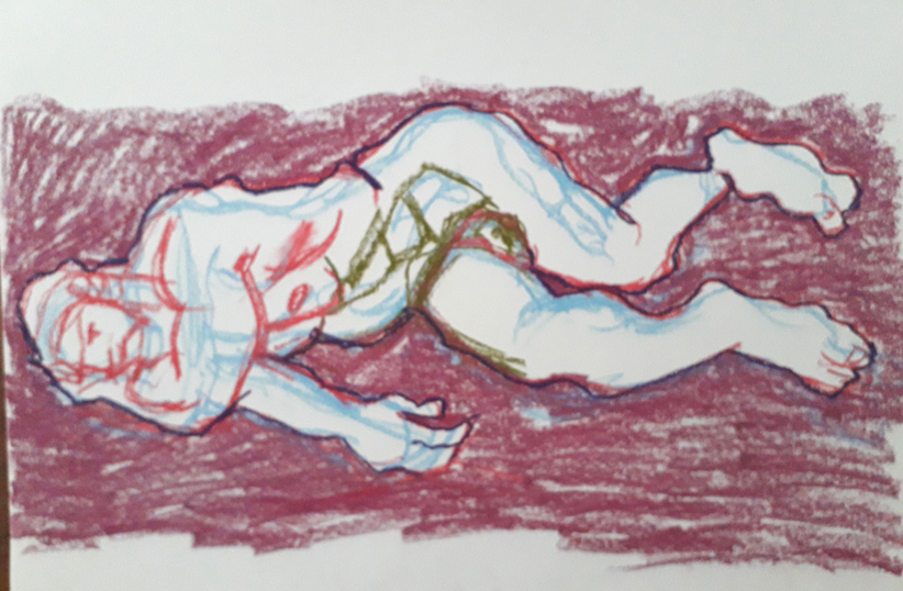 Here’s a 30 minute drawing from the life drawing session at Swansea Print Workshop the other evening. I went a bit skewiff with this one, with some deliberately wobbly lines, having a bit of fun with the shapes and pushing myself away from representational drawing. I’m using Daler Rowney soft pastels onto vintage paper.