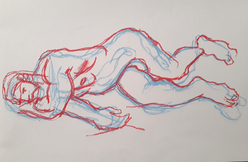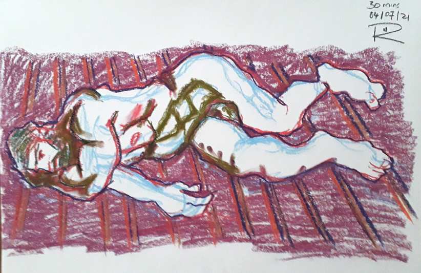 Here’s a 30 minute drawing from the life drawing session at Swansea Print Workshop the other evening. I went a bit skewiff with this one, with some deliberately wobbly lines, having a bit of fun with the shapes and pushing myself away from representational drawing. I’m using Daler Rowney soft pastels onto vintage paper.