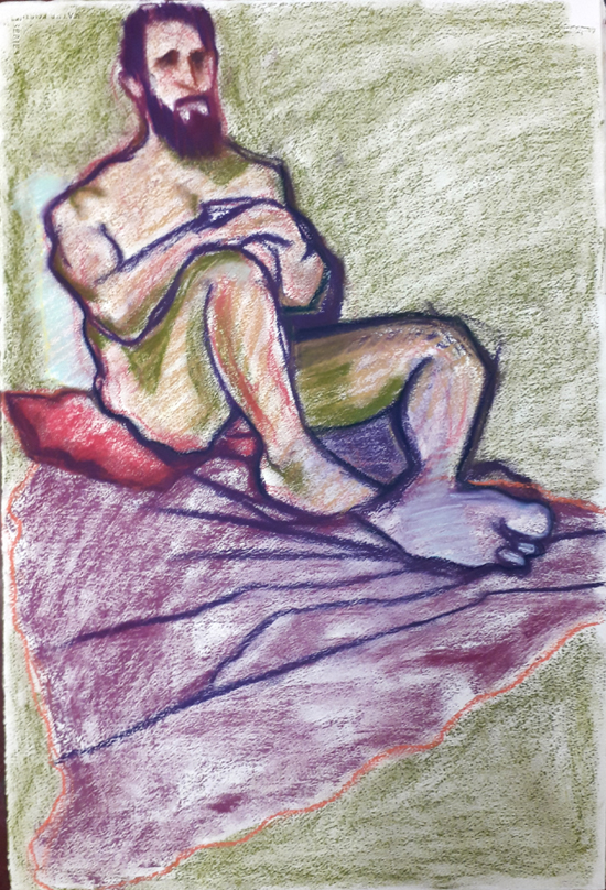 Here’s the last life drawing I did at this week’s session, it’s a 50 minute pose and I used Daler Rowney Artist’s soft pastels onto a heavyweight vintage paper. It’s always a bit of a problem fitting the model onto the paper, so framing the subject is important. I decided to put our model into the background so I could fit him all in and emphasised the geometric shapes of the materials and cushions he was sitting on to fill up the rest of the paper.