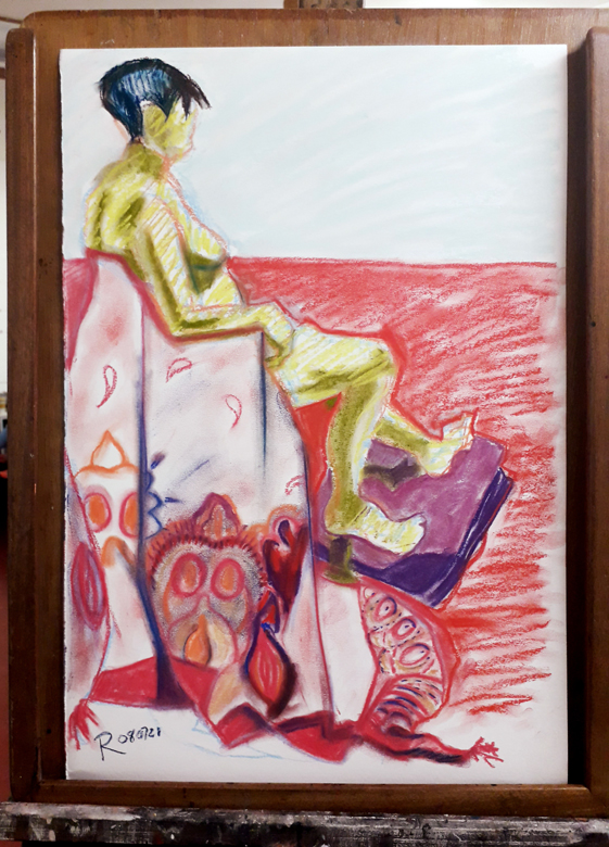 Here’s the one-hour final pose at Thursday’s life drawing at Swansea Print Workshop. I broke out the Daler Rowney Artist’s soft pastels and worked onto a heavy vintage paper. I had enough time to work up some of the details, especially in the model’s own beautiful quilt.