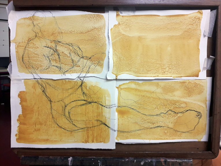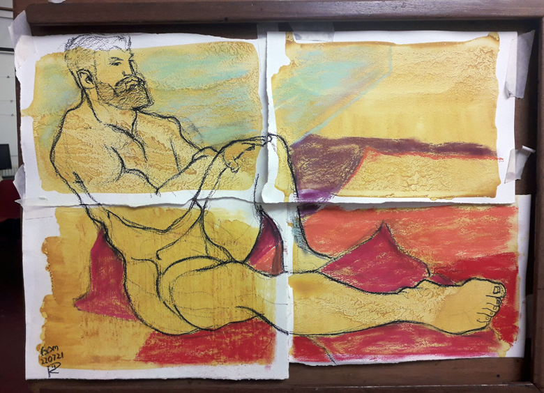 I tried something different for the final, one hour, pose at life drawing last week. I had these four pieces of paper that had been coated with yellow printing ink. I’d fished them out of a bin and they’d been knocking around for ages. So I loosely taped them to my drawing board and drew our model right across them, with conte crayon and Daler Rowney soft pastels. I liked doing it, drawing over the separate pieces sort of distracted me and I didn’t obsess so much about it. The rough texture of the paint adds something as well. I also like recycling stuff, I never throw anything away. I’m always surprised at the amount of stuff that ends up thrown away as rubbish in the bin at the workshop.