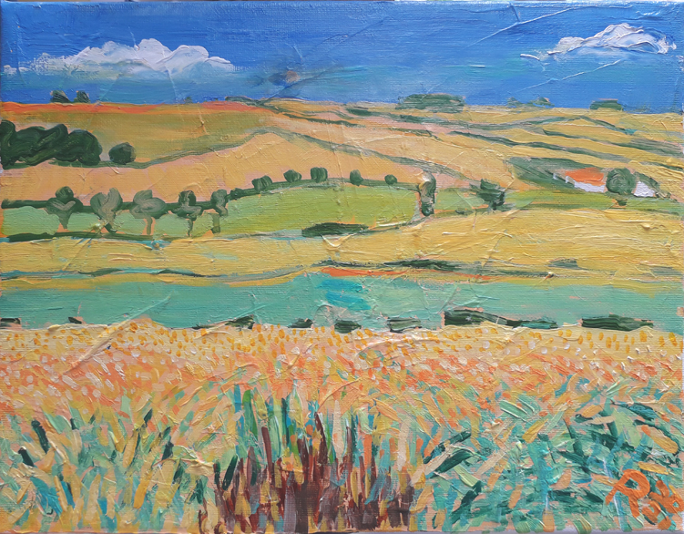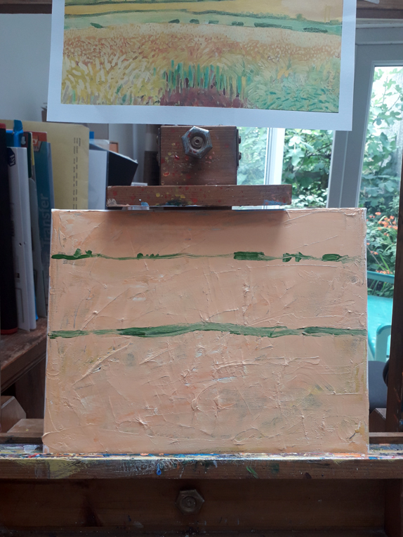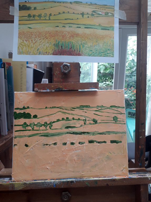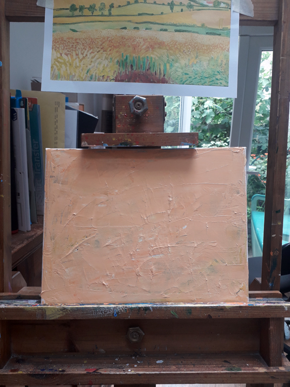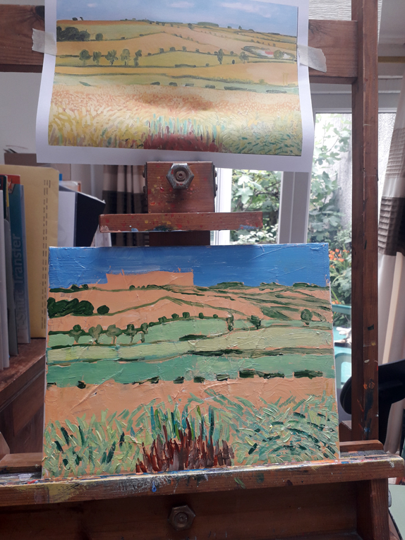 Here’s the latest fake I did with Ed Sumner’s Cheese and Wine Painting Club on Facebook. Ed started the weekly lunchtime sessions at the start of Covid19 lockdown in March last year and he’s done about 70 so far. This week it’s a copy of a painting by David Hockney. I think the original shows that Hockney may be very influenced by van Gogh. I used a recycled canvas that had been painted on before; this gave me a lot of choppy texture to start with which I think fitted in well with the layered, fractured style of the original.