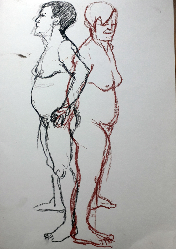 Here are the two quick 5 minute poses from last night’s life drawing session at Swansea Print Workshop. I was really tired when I got there, just had time for a bit of tea after work, and I decided not to use an easel but to sit down and draw. Problem with that is the proportions go a bit skewiff, it always seems to happen when I’m not standing to draw. But my legs told me that I’m just going to have to live with that.
