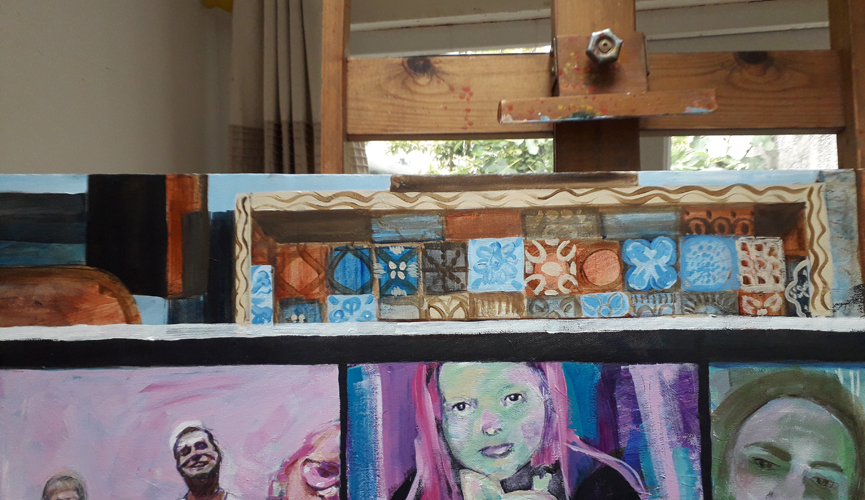 I carried on working on the background in my family zoom quiz painting, putting in the bit of the living room I could see over the upper edge of my laptop. I like it better than my original idea of having the individual ‘boxes’ just hanging in blackness.