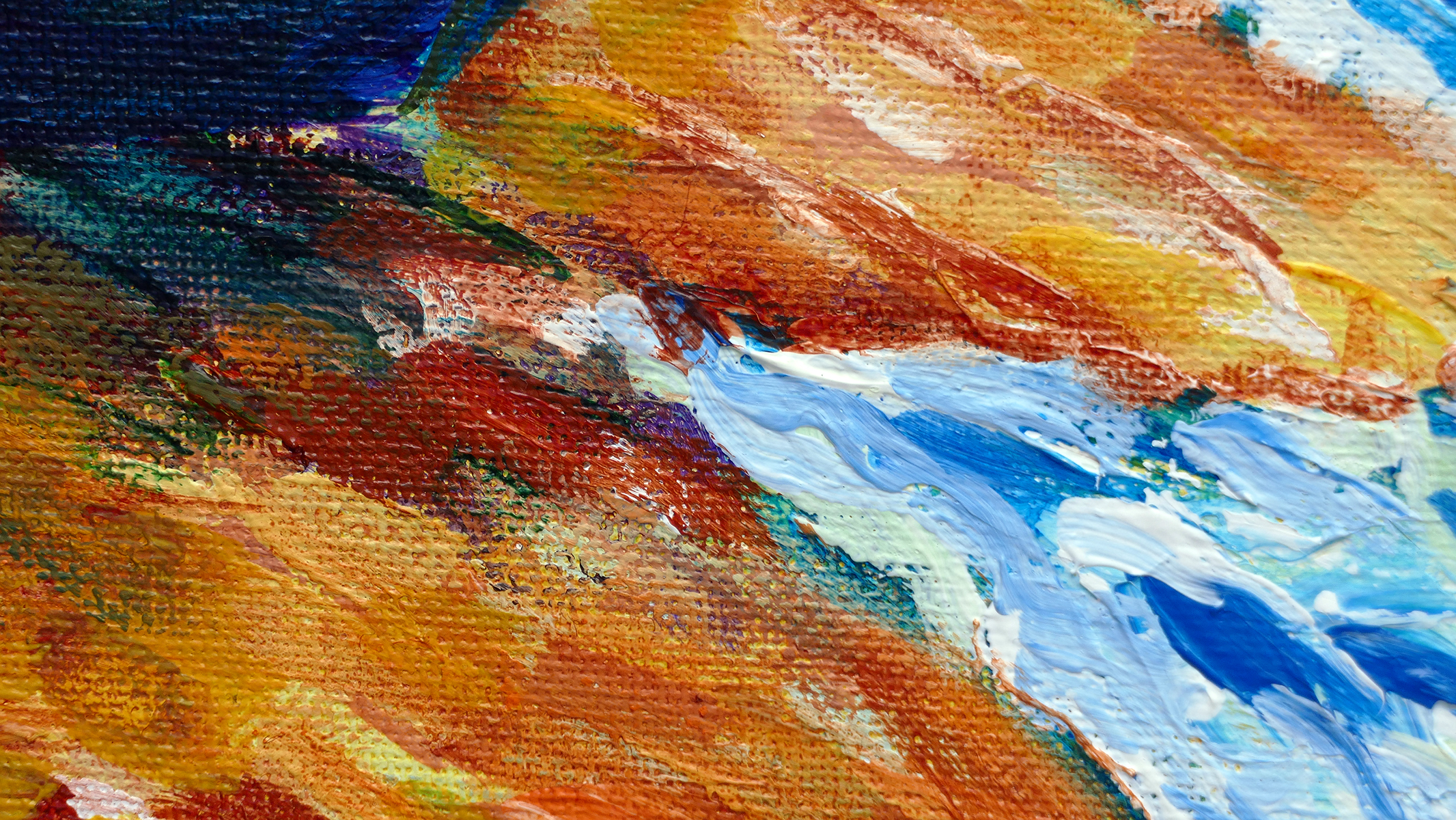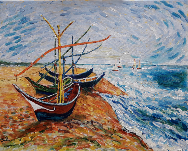 These dynamic brushstrokes are from a “fake” I did of a painting by Vincent van Gogh, “Fishing Boats on the Beach at Les Saintes-Maries-de-la-Mer“, which was painted when Vincent was living in Arles in the south of France and had a trip to the seaside for a week in 1888 to help with his health. He was so excited to be at this little fishing village and did loads of drawings and paintings. This painting was based on drawings he did, because the fishermen put out to sea so early each day that there was no time to paint the boats on the spot.
