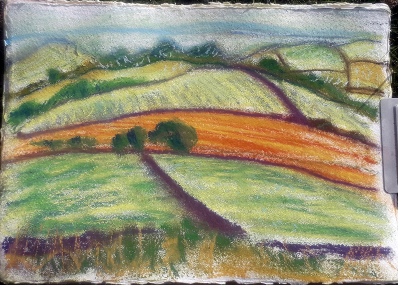 Here’s my pastel drawing, using Daler Rowney Artists Pastels onto Khadi handmade paper. I stopped to sketch on a walk across Birkrigg Common.