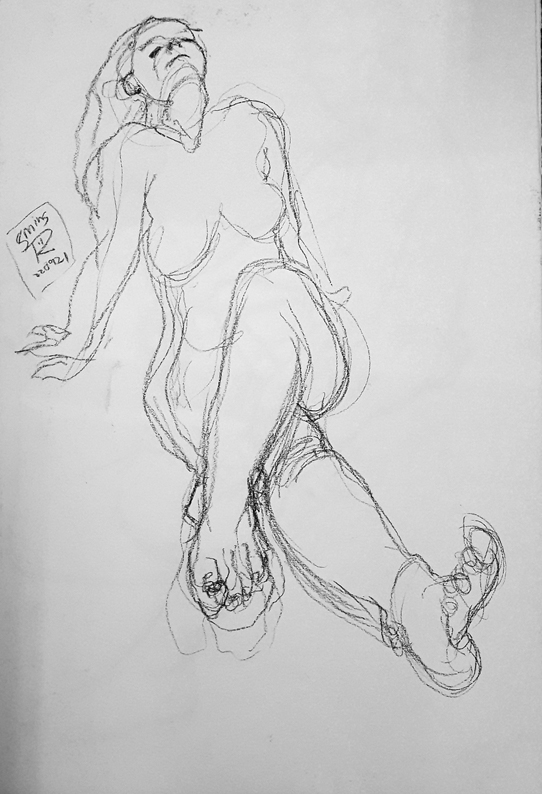 It’s October and it’s back to normal with life drawing, sketching, painting and printmaking. Through September I mostly blogged about my charity fundraiser, but now I’m going to be posting about my everyday arts practice so here goes with some of the life drawings that have been building up over the past month. I was trying something a bit different with the pastel drawing (above). It was the final pose of the session, a full hour, so I decided to do something other than my normal rather academic, representational style. And the one below is the first, a five minute pose.