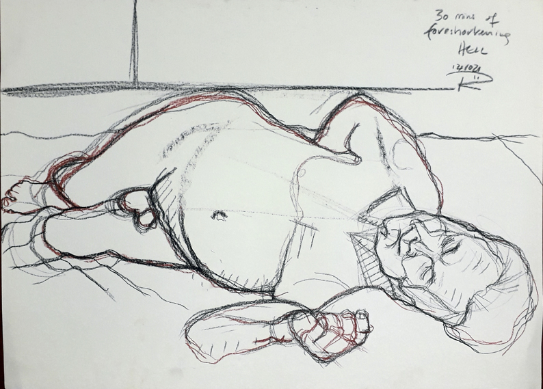 I’m always up for a recliner at life drawing, even though I often get some wicked foreshortening to draw. And last night’s session at Swansea Print Workshop handed me this one! Not only foreshortening but also an upside down head as well. And an awkward hand. Ah well, it’s good practice.