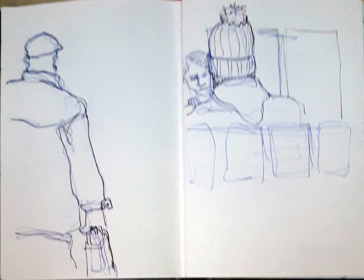 A big national company bought out a load of post offices and set them up in their city centre shops. So now there are no little post offices in the city centre. But the big company doesn’t seem keen to employ enough staff to serve in their central post office so there are always huge queues when I go in. No matter what time or day, there are usually only two people serving a queue that’s snaking across the top floor and in these days of Covid19 separation, often backing down the stairs as well. Anyway, it gives me time for a bit of scribbling. I used a ballpoint pen into my A6 bound sketchbook.