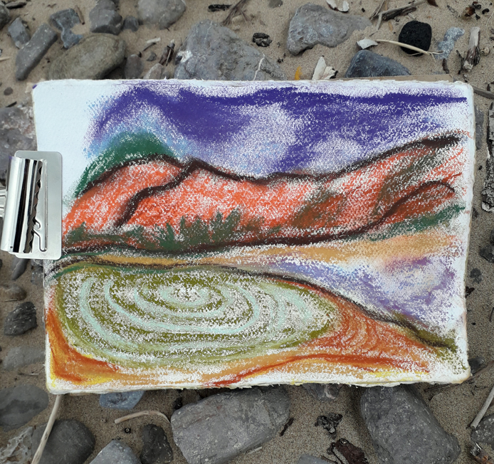 Nice day so went for a walk out of the city, along the Pennard Pill valley route to Three Cliffs Bay. It was cloudy and very windy so I only stopped to do a quick scribble, with Daler Rowney soft pastels onto Khadi paper. There’s a stone spiral, called by locals “the labyrinth” where the valley meets the beach, so I scribbled this with the hillside in the background, a blaze of russet and rich browns against the overcast purpley-blue sky.