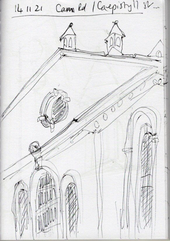 “Draw what you see, not what you think you see”. It sounds like stating the bleedin’ obvious but it’s so easy to look at something and think, “that looks weird, look at the odd angles” and try and make it better. I force myself to concentrate on being fairly accurate; even though my style is very scribbly I look and measure and look and measure to try and get everything in it’s actual place instead of where I think it ought to be. I was looking up sharply at this old chapel looming above me on a hill and the angles were actually really this odd.