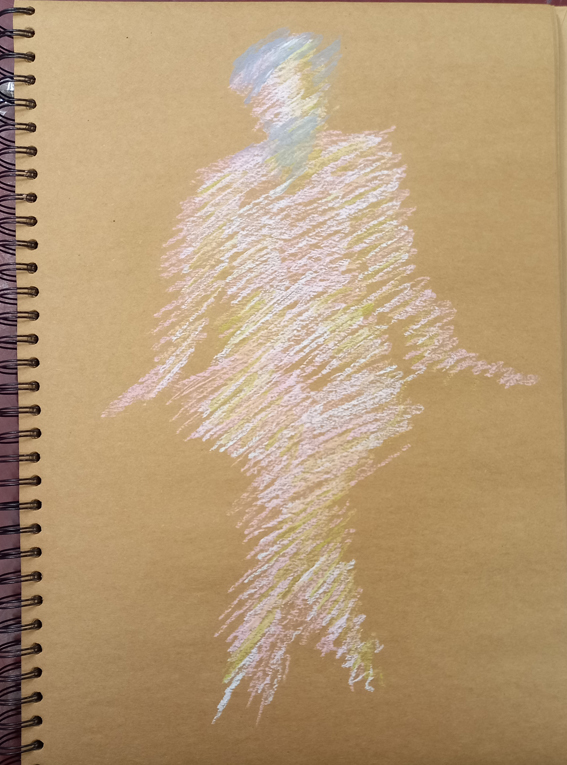 I tried out a different approach to life drawing the other evening, at Swansea Print Workshop. I’m working into a large A2 size brown paper sketchbook with soft Rembrandt pastels. My drawings are usually quite representational but this time I loosened up and had a scribble. It made me look at the model in a different way, identifying the patches of colour on her skin rather than details.