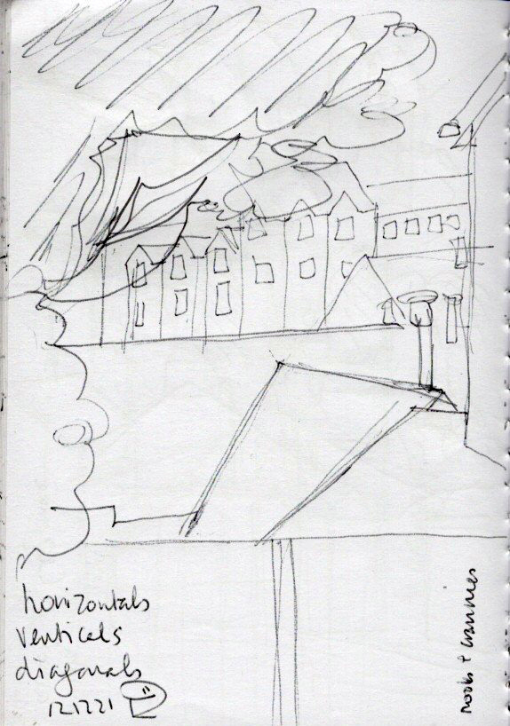 Sketching in the streets around Waun Wen, I stopped and scribbled this little arrangement of horizontal, vertical and diagonal lines. I suppose you could say that most vistas in a built environment are horizontal, vertical and diagonal. And you’d be right 😀