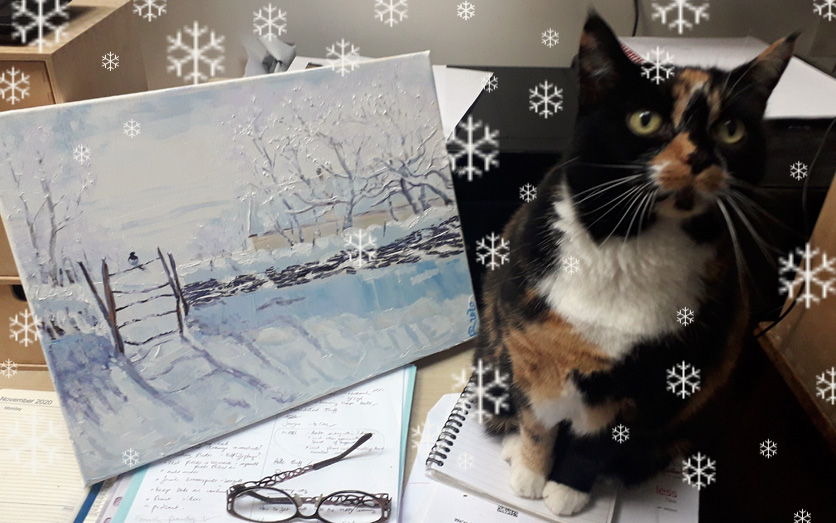Here’s Sparta Puss being very seasonal with a little fake Monet I did a while back – it’s called “The Magpie”. Sparta Puss hates magpies. They come and nest in the tree next door every year, I think it might be the same pair, I don’t know how long they live. They pick stones out of the guttering and throw them at her when she’s in the garden. And if she’s sitting on the bedroom window sill, they prance around on the roof outside screaming at her and taunting her. She really hates them. She doesn’t look at all impressed that I did a painting of one.