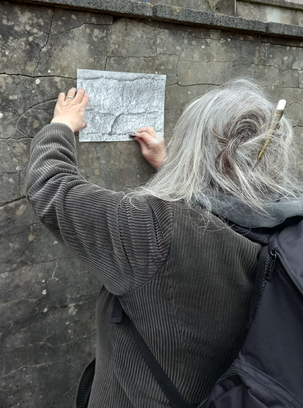I was out and about in Waun Wen in Swansea today, with two students from Swansea University who are working with me on the arts project. It’s been a grey and bitterly cold day, but we spent 2 hours walking the streets, making graphite rubbings of the different textures of the area – street metal covers, trees, walls and pavements. We’ll use these to make collage kits over the next week or two. We used Koh-i-Noor Progresso Jumbo Woodless 6B graphite sticks (cut in half, I’m thrifty) and Ho-sho Japanese paper.