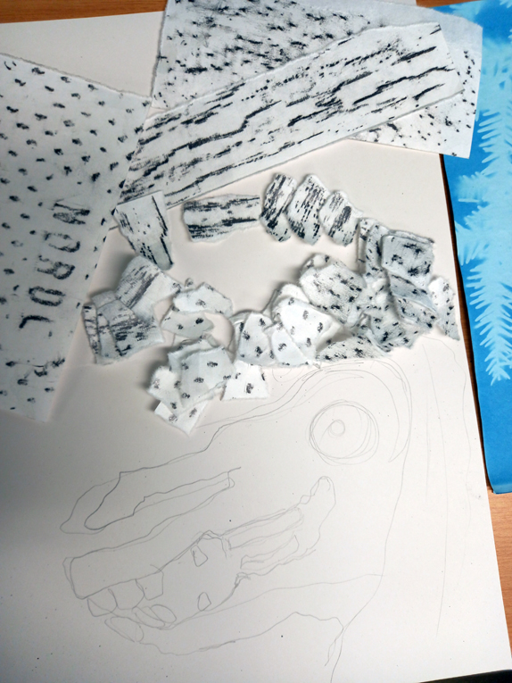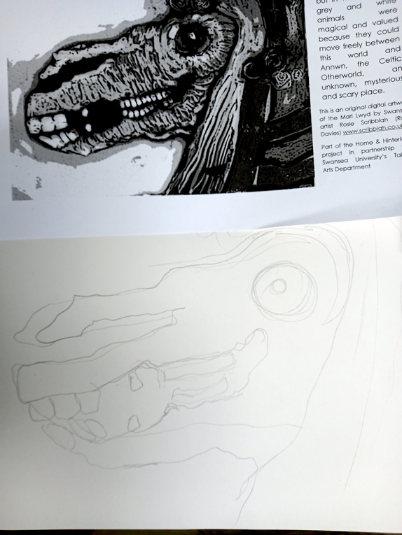 I started with a digital Mair Lwyd image I made, as a guide, drew it roughly onto paper and then ripped up my collage papers, grabbed a Pritt stick and got sticking. The collage papers are made up of graphite rubbings of manhole covers and other textures around the area (Koh-i-noor graphite onto Ho-sho paper) and cyanotypes (sunprints) made with local plants. Got a bit more to do over the weekend to finish it…