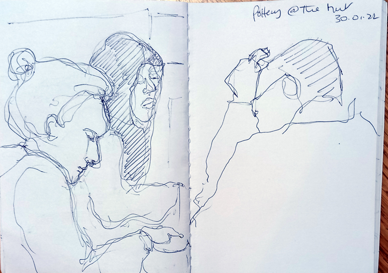 Spent a lovely afternoon at the community centre in Waun Wen today, working alongside local ceramicist Esther Ley who was running a short workshop, making porcelain cups. It was good to be able to have a small group of people together, within Covid19 restrictions of course. I had to have a quick scribble, I can’t help myself. It was an intergenerational group, older people through to children and the mix of people worked really well.