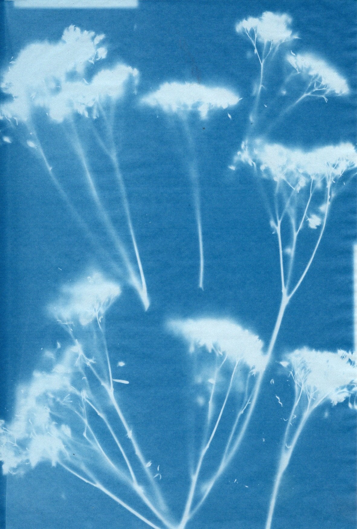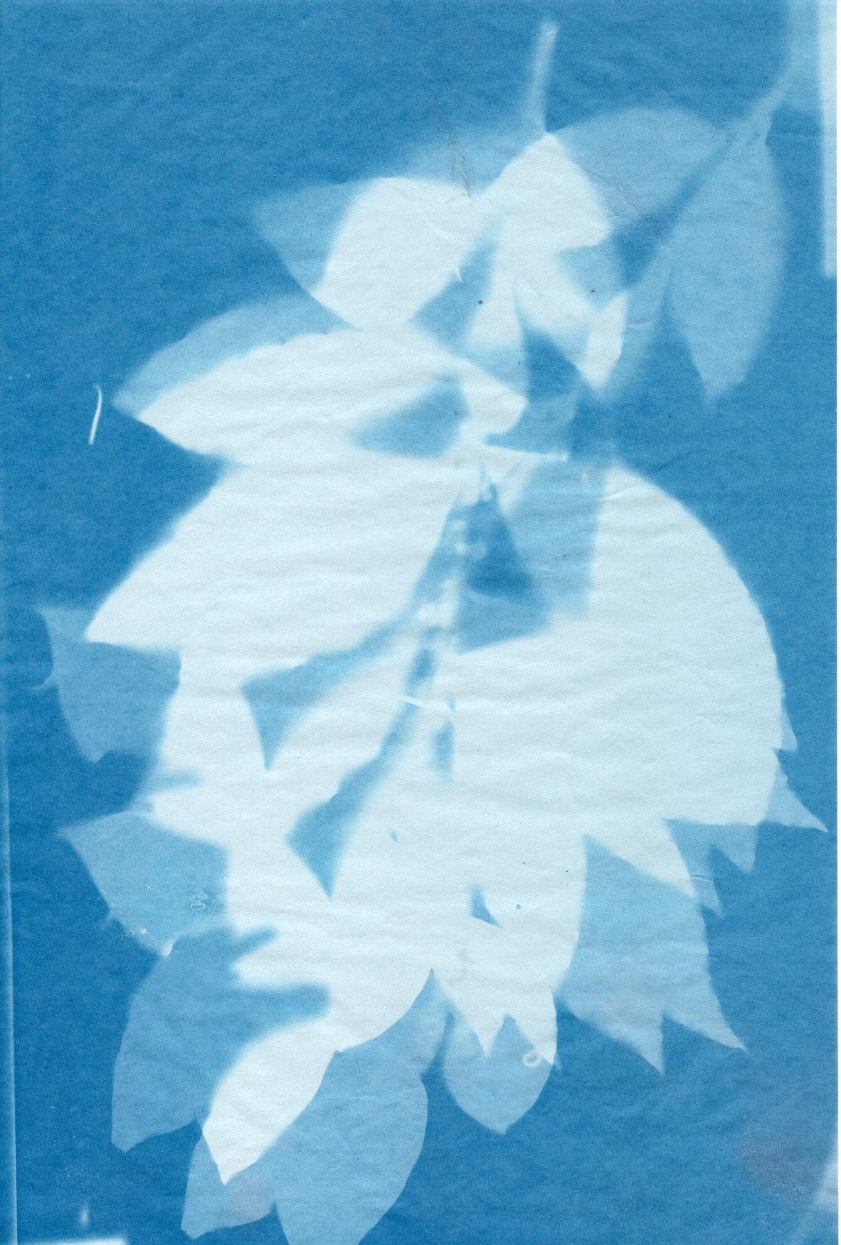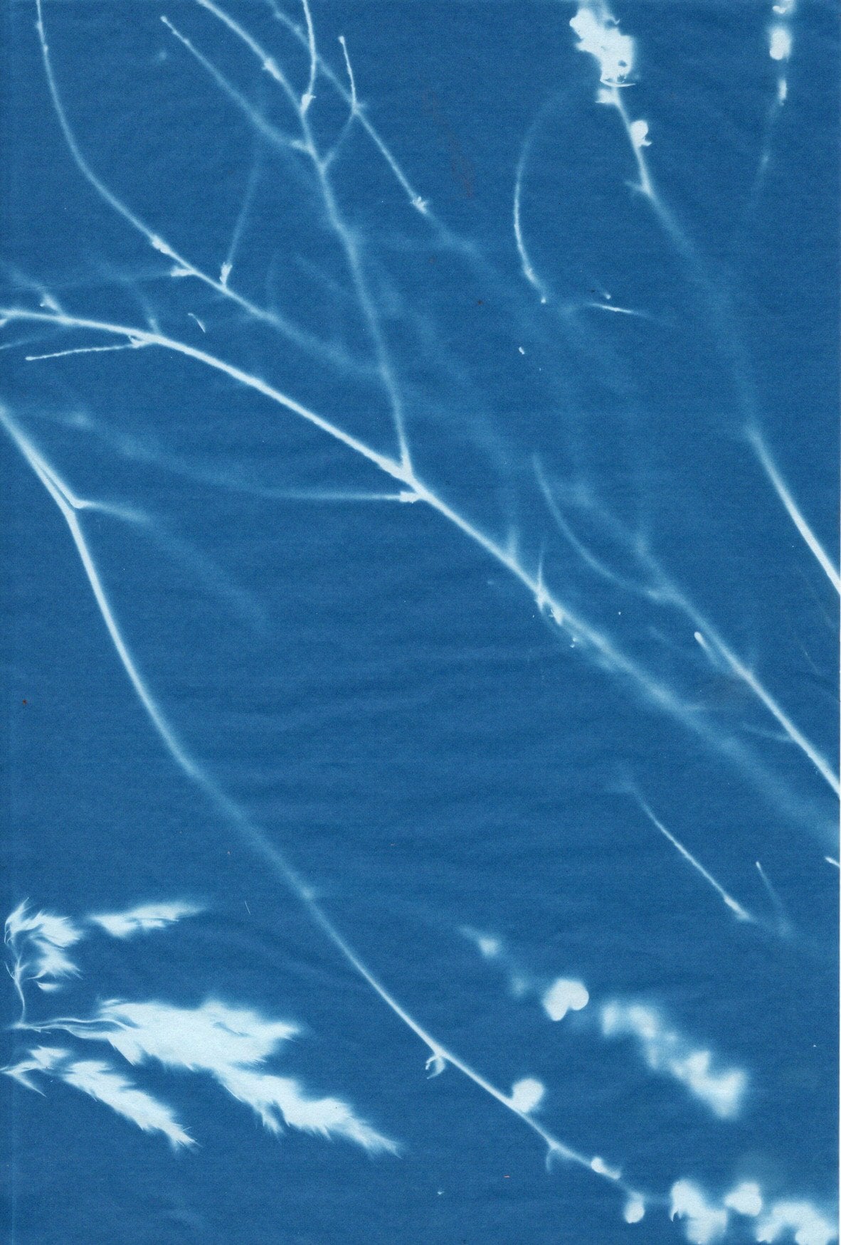Here are some of the cyanotypes (sunprints) that I’ve been doing with local residents in Waun Wen park recently. I’ve been using plants found locally – some sedum spectabile seed heads, crocosmia seeds and bay laurel. I used commercially coated cyanotype paper and exposed outside for 8 minutes (it’s winter, the light is weak). I moved the piece of bay laurel half way through and that’s why there’s a sort of shadowy effect. It’s one of my favourite plants – hardy, evergreen, nice shaped leaves and lovely to cook with.
