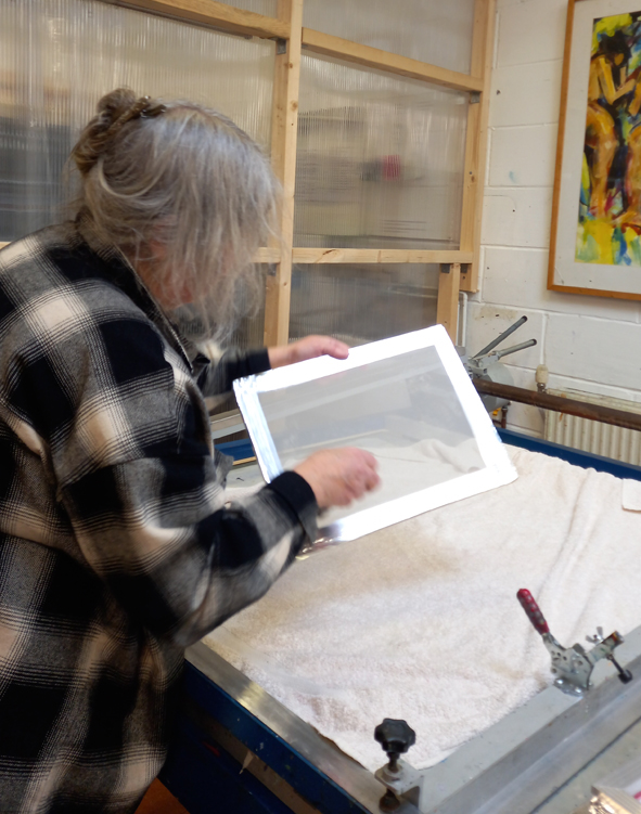 I spent a happy morning geeking out at at Swansea Print Workshop, coating my new silkscreens with photosensitive solution and exposing and developing images from the acetates I prepared recently.