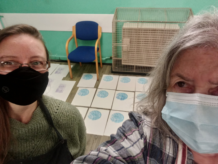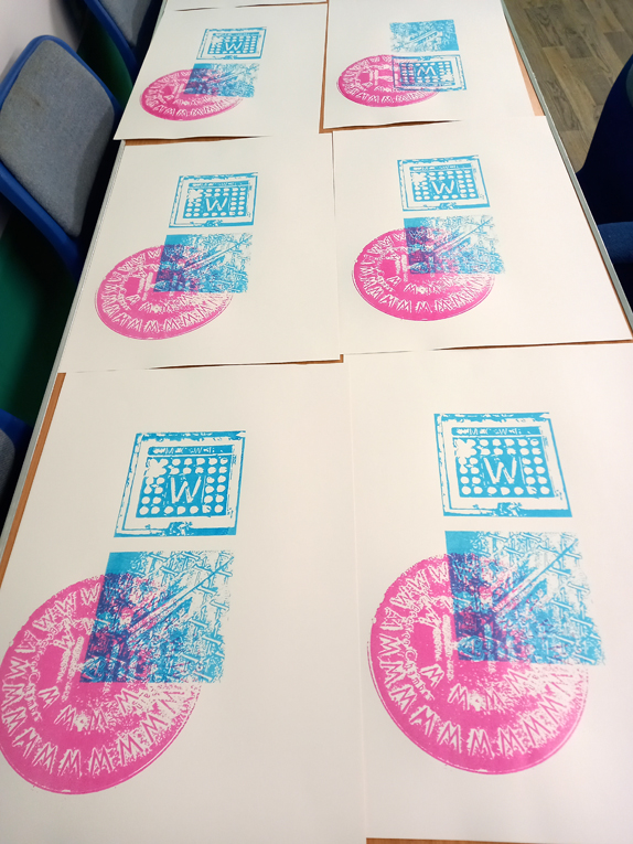 I was joined by our local councillor Hannah who is also an experienced screenprinter and she printed another set of manhole images in blue, on the floor behind us. I’m not used to taking selfies, this wasn’t my first attempt to get something half decent 😀