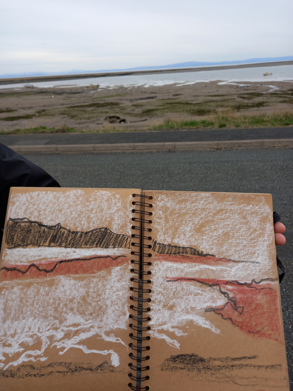 Another quick sketch from my recent holiday in The Lake District. Husb and I went walking along the causeway at Roa Island, very different to the usual scenery in the Lakes. It’s very flat marshes either side of the narrow, very straight, road. I used conte crayons in black, white and sanguine into a brown paper sketchbook.