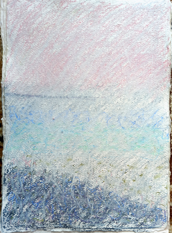 Husb and I spent a few days in The Lake District, on a little peninsula called Roa Island, in a house with a tower and fantastic scenery over Morecambe Bay and the Irish Sea. One day it was light but foggy so I decided to draw the view from one of the Tower windows. It was hard! It was so misty and indistinct and the colours so subtle. It reminded me of some of the atmospheric paintings of J.M.W. Turner. It’s more complex than it looks, it’s built up of layers and layers of little marks in lots of colours, using Rembrandt pastels onto a very heavy and textured Khadi handmade paper. It’s interesting coming so far out of my comfort zone.