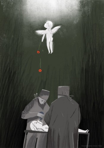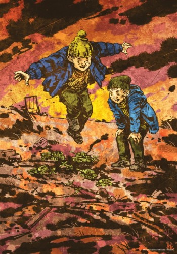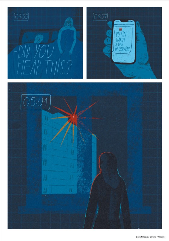 Below from left to right: Daria Filipova “24 02”: Grasya Oliyko “HOME”: Mari Kinovych “REFUGEE”: Illia Uhnivenko “NEW CHILDHOOD”.