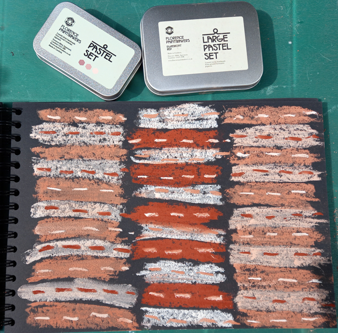 I gave my new pastels from Florence Paintmakers a go today, on some black paper, just messing around to get the feel of them. Nice. Looks like a box of sausages though 😀