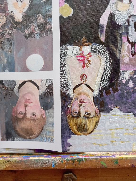 I started this painting ages ago, back last year, when we were in lockdown and I was painting weekly with Ed Sumner’s “Cheese and Wine Painting Club” on Facebook. It’s a famous work, “The Bar At The Folies Bergere” by the Impressionist painter Edouard Manet. I’ve been putting off finishing it, partly because of life, work and Covid19 but also because I was stuck on the finer details, especially the model’s face. So today I told myself to get on with it and took a new approach. I turned it upside down. And it worked!!!! So much easier. I’ll do the rest of it upside down now.
