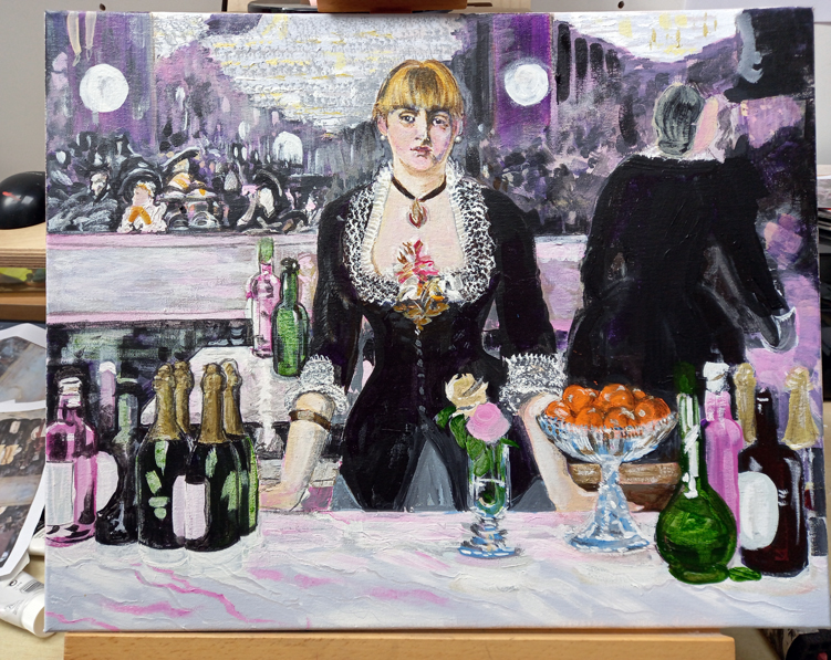Here’s where I am now, it’s mostly done but I have got to get stuck in to all the details, all the fiddly bits…. It really makes me appreciate what a talented painter Edouard Manet was.