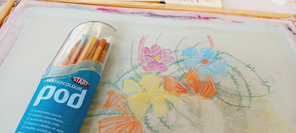 Towards the end of the day I spent up The Workers Gallery in Ynyshir last week, I had a fourth, final, attempt at doing a monotype with a silkscreen and Daler Rowney acrylic screenprint medium. My experiments with Inktense blocks were a miserable failure (here) so I switched to watercolour pencils. First, I printed a portrait sketch with a dark blue pencil (here) which was okay. So I decided to overlay this with another attempt, using other colours to put some flowery bits in the background. The result is alright, but no more than that. So, more experimenting I think.