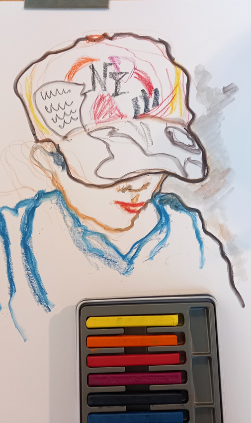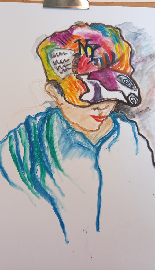 I spent a few happy hours at GS Artists today, at the opening of their next series of 9-to-90 community art events (in partnership with HARBWR Arts On Prescription). Of course, I had to have a scribble. There was a sweet little boy sitting opposite me, engrossed in his drawing. He had a big, bright hat on so I got out my Derwent Inktense colour blocks and my water reservoir brush and scribbled away. He seemed chuffed with it too.