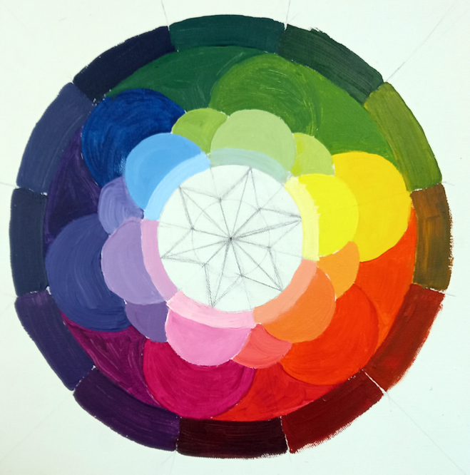 I carried on working on the colour theory mandala I started last week. It doesn’t do any harm to get back to basics now and again. I’m focusing on mixing colours at the moment but when they’re all in place, I’ll pay attention to the brushwork – it’s a bit rough. I’m using Daler Rowney System 3 acrylic paints onto a stretched canvas.