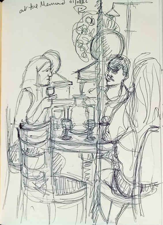 Husb and I were getting a bit stir crazy working from home so went out for a cold drink this evening and sat outside a nice cafe bar for a little while. I had to have a scribble of course. The main thing about these little sketchbook drawings is not to get a perfect representation of a scene – there isn’t anywhere near enough time for that. It’s to get an impression and also to work out the proportions, perspective and so on. I like to use the continuous line drawing technique for this.