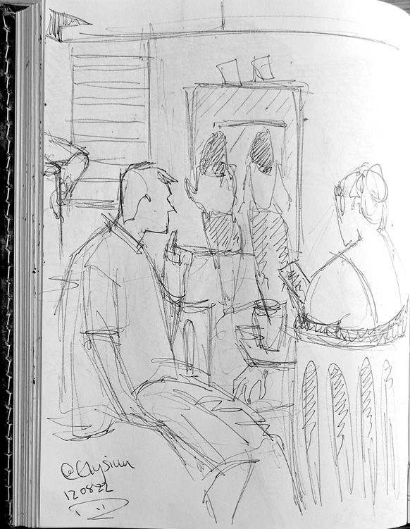 Husb and I went to see some musicians last night, Tom Emlyn and Sarah Passmore, in the Elysium Gallery Bar. Of course, I had to have a scribble. I used a ballpoint pen into an A5 leather-bound sketchbook.