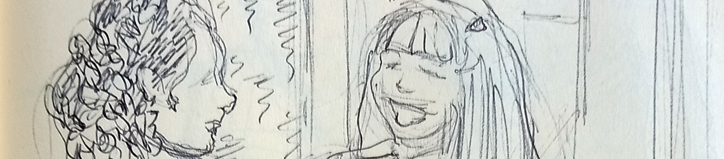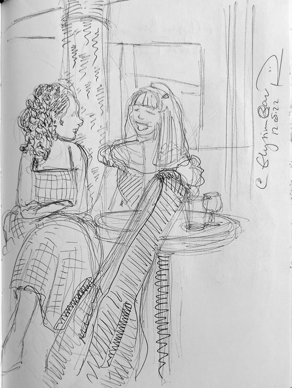 Here’s another of my sketchbook drawings from the Elysium Bar the other evening, two friends engrossed in talking. Lovely.