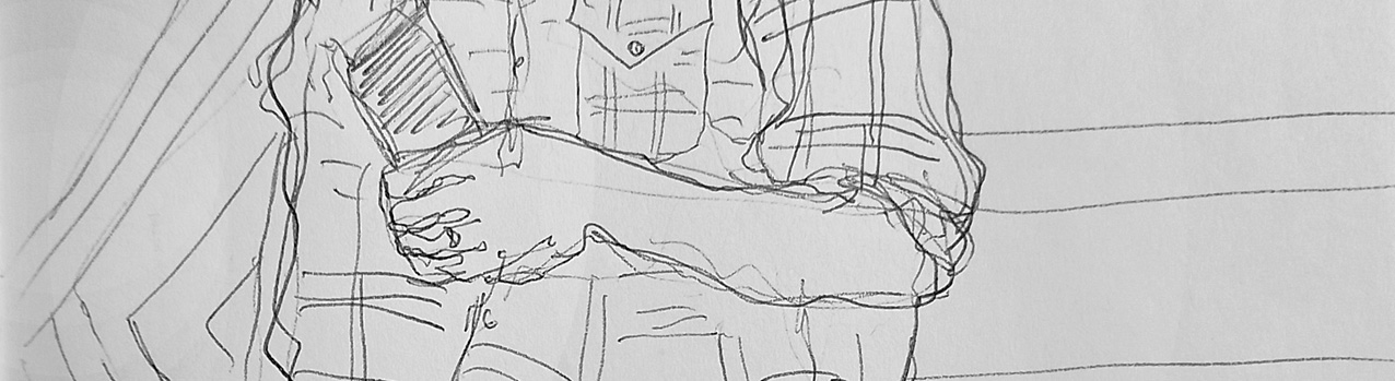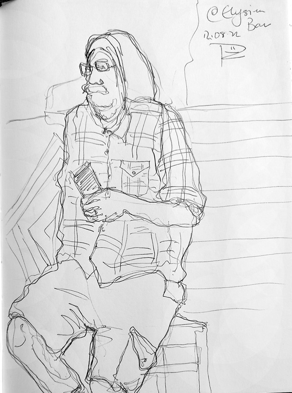 Here’s the last of the sketches I did in Elysium Bar the other evening. Gigs are good for scribbling because people are generally focused on the performers and keep reasonably still. Tom Emlyn and Sarah Passmore were playing – check them out, they’re fab.