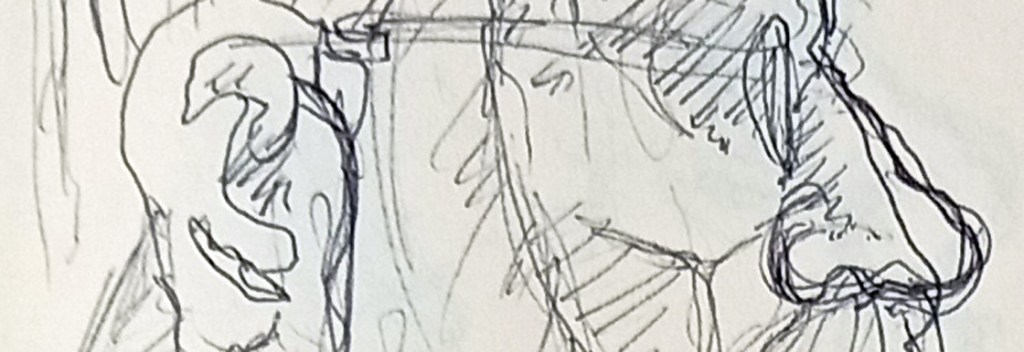 Husb and I went along to Carmarthen last Friday evening, to the Lyric Theatre to see Theatr naNog’s new show, Operation Julie – a Rock Musical. It was FANTASTIC! Of course, I had to have a scribble of the audience – with a ballpoint pen into my leatherbound A5 sketchbook.