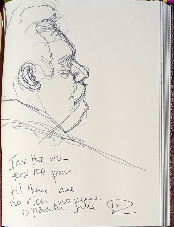 Husb and I went to The Lyric Theatre in Carmarthen last week to see “Operation Julie – A Rock Musical” – it was brilliant. It’s based on a true story that happened in Wales in the 1970s and the audience was mostly – erm – of a certain age – like me and Husb 😀 And as it happens, both the people I scribbled from the audience were older men with a lot of facial hair. It suits my scribbly style.