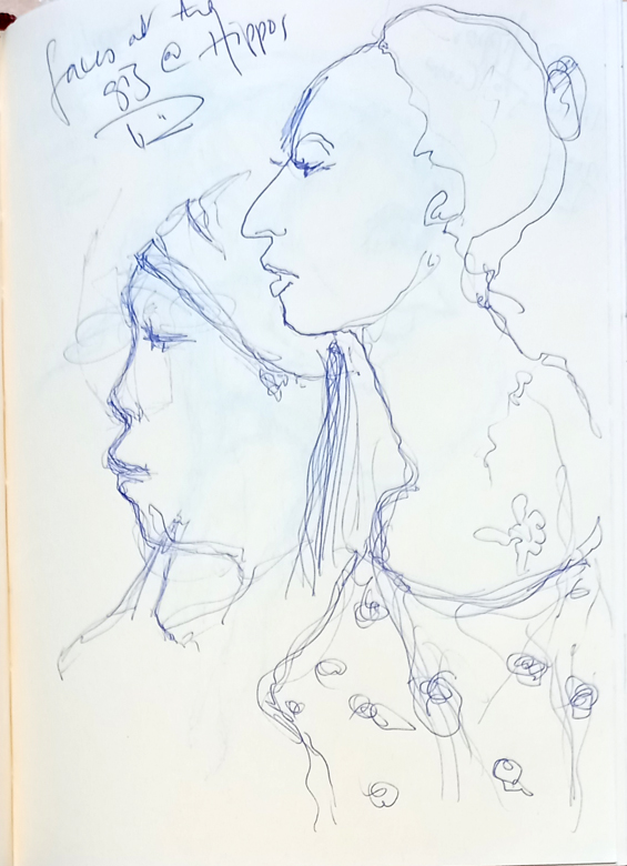 I did lots of scribbling at the gig in Hippos on Saturday night, people in audiences are usually absorbed in the performer – unless they’re dancing – and it makes drawing them easier. Here are two very interesting heads grooving to my old mate Peter Crow.