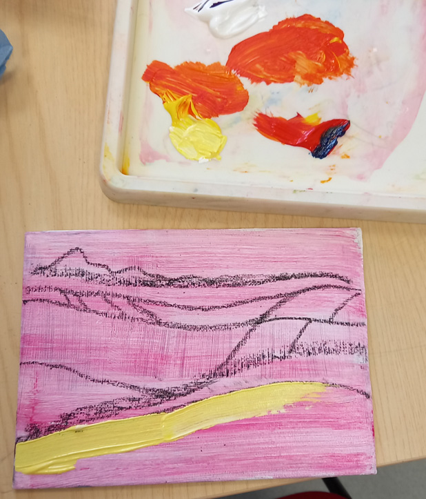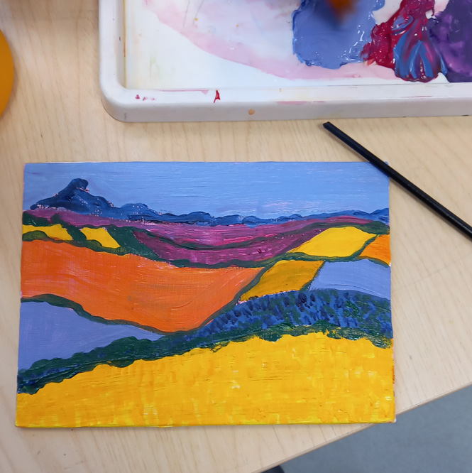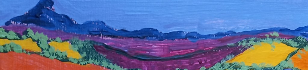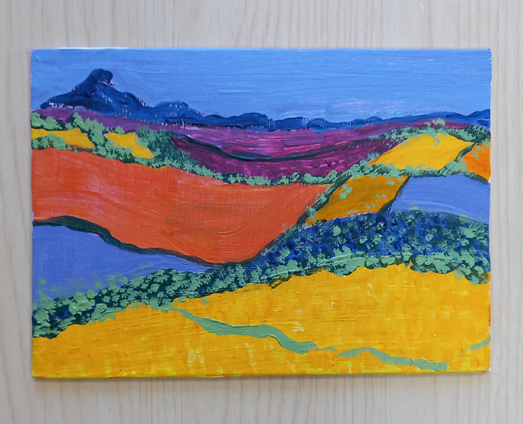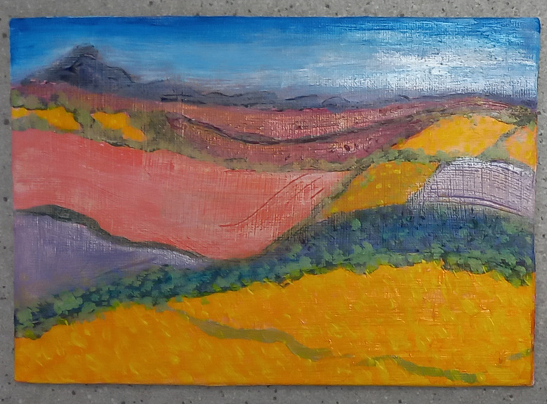 I’ve been messing around with some acrylic paint on a small canvas board, trying to make an abstract landscape from my imagination. I always work from life, I’m way out of my comfort zone doing this, but I’m persevering because I feel I need to loosen up and just try things out without being precious. I’ve been following the development of the work of artists Aletha Kuschan and Fran Williams and they inspired me to improvise.