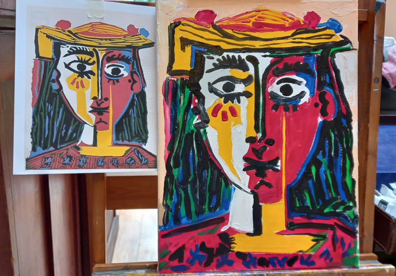 Ed Sumner’s “Cheese and Wine Painting Club” is back on Facebook! Brilliant. Ed started it during lockdown and ran it every Friday for about 18 months. Since lockdown ended and we’ve all been getting back to what we were doing before, Ed has only done an occasional one, and today was one of those days! We copied a portrait of a woman by Pablo Picasso.