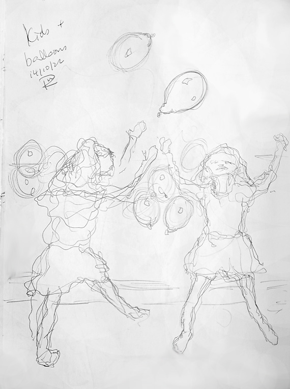 Went to a birthday party over the weekend and scribbled some kids playing with balloons. No X Boxes, no smart phones, no expensive toys. Just some balloons. What joy. They move fast, kids do, so it was good practice to sketch them.