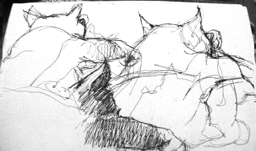 It’s Saturday #Caturday again and here are some kitty drawings from my sketchbook archives. Sparta Puss was sleeping on my lap so I did a few quick sketches of her, all on the same page, trying to capture the essence of her cattitude rather than doing a detailed drawing. I like the way the scribbles show the turn of a paw, the flick of an ear ….