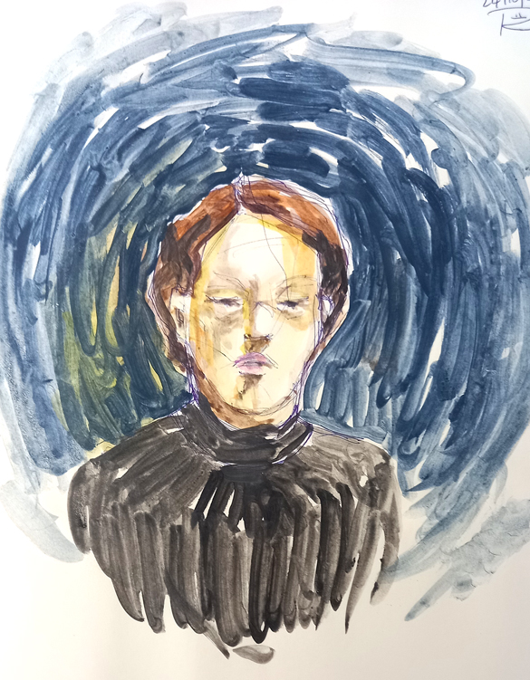 Here’s a second sketch I made at the Filia 2022 conference yesterday. I was drawing women on the stage a long way away so I had to squint a lot and I couldn’t see much detail. I used ballpoint pen and then added colour washes with Derwent Inktense blocks and a water reservoir brush. This took about 5 minutes, maximum.